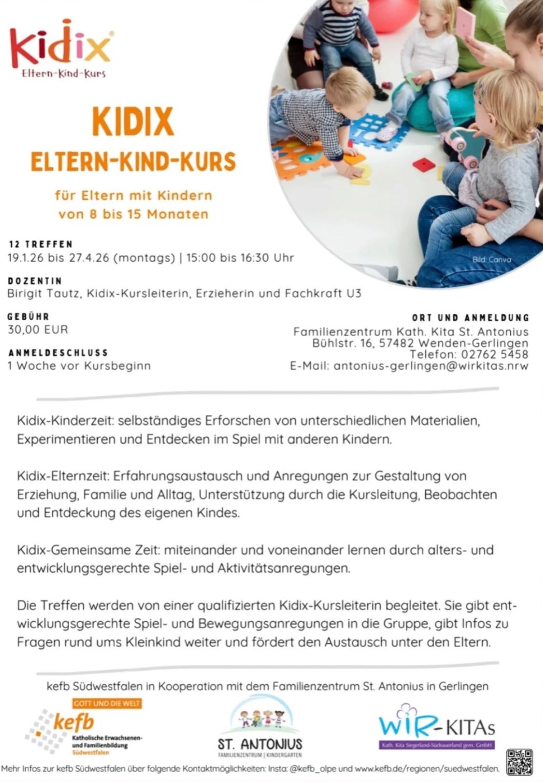 Kidix ist ein Kurs für Eltern mit Kindern von 0 bis 3 Jahren. Das Kurskonzept wurde für die katholischen Familienbildungseinrichtungen in NRW entwickelt. Jeder Kidix Eltern-Kind-Kurs wird von einer qualifizierten Kursleitung mit Kidix-Zertifikat durchgeführt.