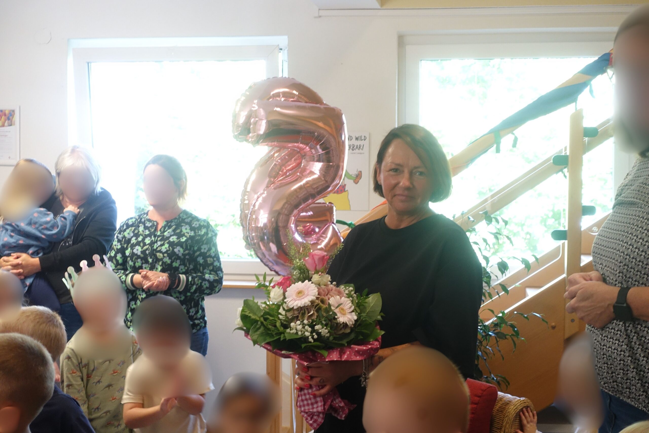 Mit einem fröhlichen Lied, gesungen von den Kindern und dem Team, sowie einem bunten Blumenstrauß haben wir diesen schönen Anlass gefeiert. Die Freude und Dankbarkeit waren groß, denn Frau Ewald hat in all den Jahren mit Herz, Geduld und Engagement unzählige kleine und große Momente mitgestaltet.
